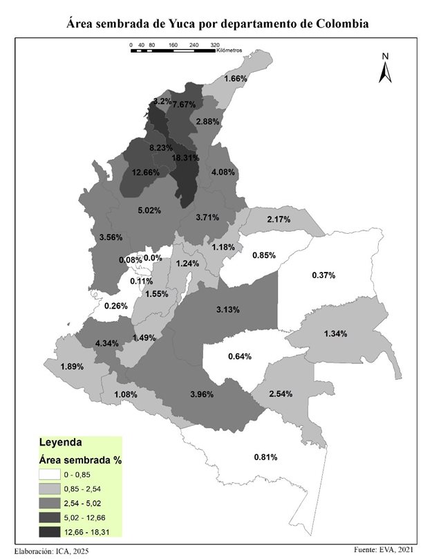 Geográficamente, la yuca se desarrolla en la práctica totalidad del territorio nacional; sin embargo, la producción se concentra en los departamentos de la Costa Caribe (Bolívar, Córdoba, Sucre y Magdalena) y los Llanos Orientales (Meta y Casanare). En contraste, el cultivo de ñame es un emblema de la región Caribe, donde los departamentos de Bolívar, Córdoba y Sucre representan en conjunto cerca del 87% del total nacional, conformando el principal clúster productivo del país (Ministerio de Agricultura y Desarrollo Rural, 2021).