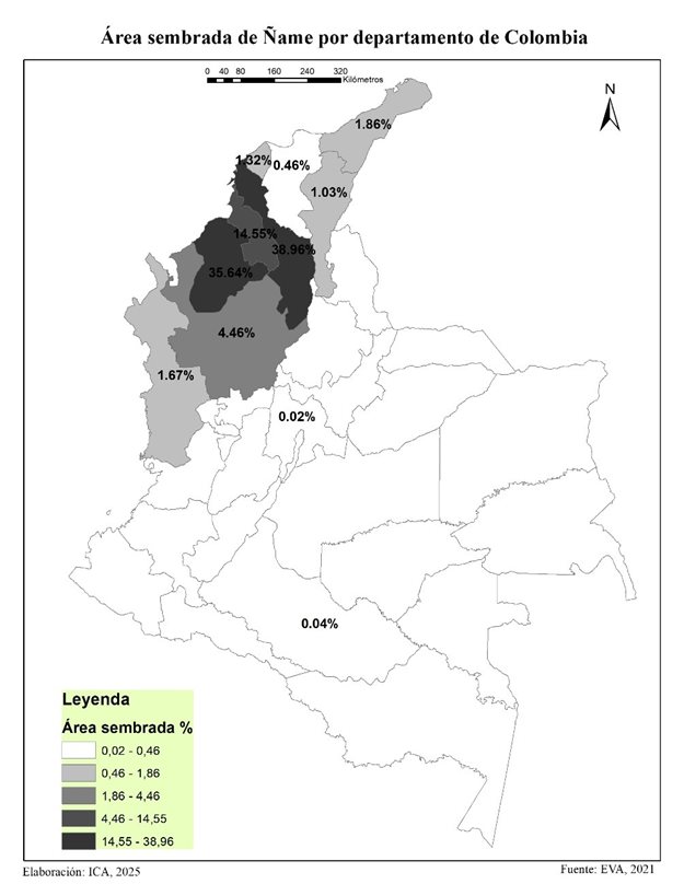 En términos estadísticos, la yuca se consolida como uno de los cultivos de mayor extensión y volumen. Cifras recientes, correspondientes al primer semestre de 2025, indican un área sembrada de 224,198 hectáreas (ha), con una producción anual que supera los 2.4 millones de toneladas (Unidad de Planificación Rural Agropecuaria [UPRA], 2025a). Por su parte, el ñame, aunque con una superficie más concentrada, registró para el mismo periodo un área de 37,791 ha. La producción nacional consolidada de ñame para el año 2023 fue de 453,924 toneladas, con un rendimiento promedio de 13.3 toneladas por hectárea (UPRA, 2024) (Figuras 1 y 2).