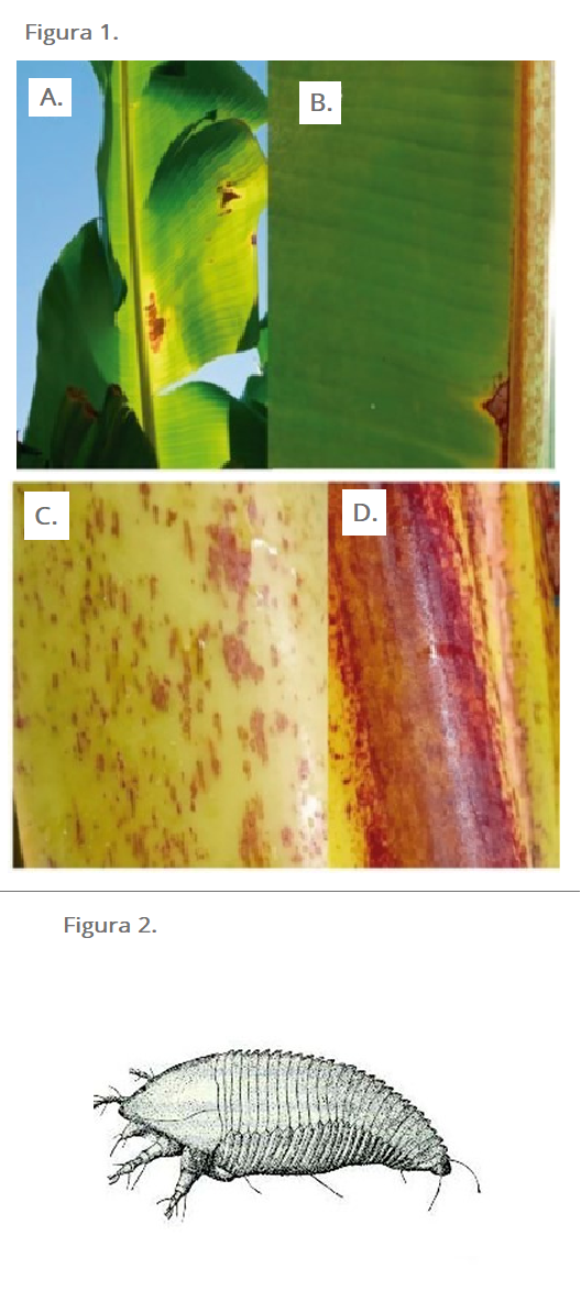 ImportanciaLa especie Phyllocoptruta musae Keifer (Acari: Prostigmata: Eriophyidae) fue descrita en Queensland, Australia y tiene como hospedantes especies de la familia Musaceae. En el hemisferio oriental, P. musae ha sido reportado en tres países únicamente: Australia, específicamente en el estado de Queensland, China, en la región autónoma de Guangxi Zhuang y en la isla de Hainan, y en Tailandia (Gómez – Moya et al., 2021). En República Dominicana, se reportó la presencia de P. musae en la región noroeste, en plantaciones de banano (híbridos Gran Enano y Williams) ubicadas en las provincias de Valverde y Monte Cristi. La alerta sobre la presencia de este ácaro plaga se presentó en octubre de 2020, a partir de acciones de monitoreo adelantadas por productores (Gómez – Moya et al., 2021). Los síntomas asociados a la presencia de P. musae se describen como rayas marrones y cloróticas en el haz de hojas jóvenes cuando hay altas poblaciones en el envés; además, se observan manchas marrones en las hojas jóvenes, así como en el raquis y el pseudotallo (figura 1). En frutos, P. musae también puede causar lesiones similares a manchas, que afectan la calidad del producto (Gómez – Moya et al., 2021). Los eriófidos son ácaros microscópicos (0,1 a 0,35 mm de longitud aproximadamente) que se caracterizan por su cuerpo fusiforme (objetos u organismos con forma de huso, es decir con forma alargada, elipsoide y con las extremidades más estrechas que el centro del cuerpo. El género Phyllocoptruta se caracteriza por un gnatosoma (parte del cuerpo donde se ubican los quelíceros y pedipalpos del ácaro) que se proyecta hacia abajo y un opistosoma (región ventral), diferenciado por anchos anillos dorsales y estrechos anillos ventrales (Xue et al., 2010) (figura 2). RiesgoPhyllocoptruta musae es una plaga ausente en Colombia. De acuerdo con Gómez – Moya & colaboradores (2021), este ácaro probablemente esté más extendido en la República Dominicana por lo que se deben realizar búsquedas cuidadosas en todas las áreas productoras de Musa spp. Éste es el primer reporte de P. musae en el Neotrópico, incluso para América. En las provincias de Valverde y Monte Cristi, República Dominicana, se observaron síntomas graves y poblaciones elevadas de este ácaro eriófido por lo que este primer reporte alerta sobre la necesidad de adoptar medidas de prevención y control para minimizar su impacto en toda la región, especialmente en los países productores de plátano y banano. HospedantesEspecies de la familia Musaceae (Musa spp.) Distribución - Asia: China, Tailandia. - América: República Dominicana. - Oceanía: Australia. Gómez – Moya et al., 2021 Referencias Gómez - Moya, C.A, Amrine, J.W., Fletchmann, C.H., Campos D., Navia, D. & Suarez, P. 2021. First record of Phyllocoptruta musae (Acari: Progstigmata: Eriophyidae) in the neotropics, in Hispaniola. Novitates Caribae 18:209-213. Xue, X., Zi – Wei, S. & H. Xiao. 2010. Review of Phyllocoptruta, with Descriptions of Two New Species (Acari: Eriophyoidea). Annals of The Entomological Society of America. 103(5):697-705.