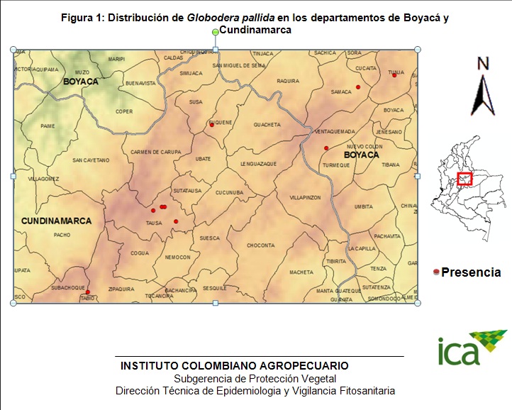 Como parte de las acciones de vigilancia realizadas por el Instituto Colombiano Agropecuario (ICA), se confirmó la presencia de Globodera pallida en cinco predios de los Municipios de Tunja, Samacá y Ventaquemada en Boyacá y siete predios en los Municipios de Tausa, Tabio y Zipaquirá en Cundinamarca, localidades en los cuales no se había oficializado su presencia.