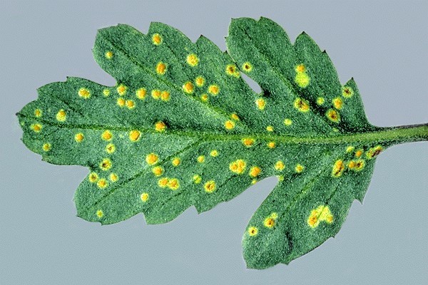 Hoja de crisantemo infectada de Puccinia horiana Tomada por CSL/Crown Copyright. En: CABI, 2014.