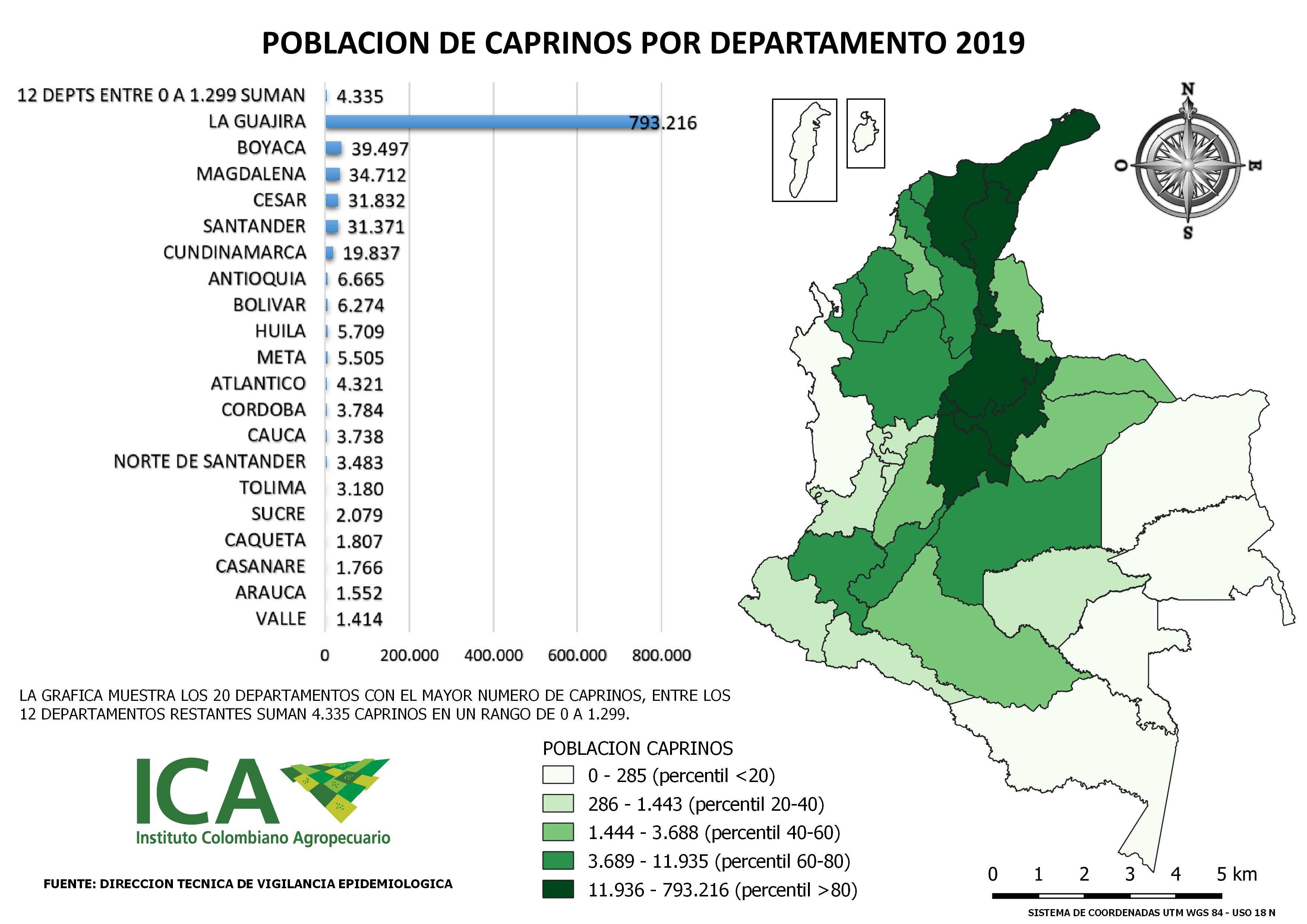 Hecho similar ocurre con la especie caprina que registra tan solo 1.000.132 animales en el territorio nacional, población concentrada en el departamento de La Guajira donde se contabiliza el del 79,24 % de la población censada, seguido por Boyacá con un 3,87%, Magdalena 3,57%, Cesar con un 3,18% y Santander con un 2,95% es en estas regiones en donde se concentra el 92.81 % del censo caprino nacional.