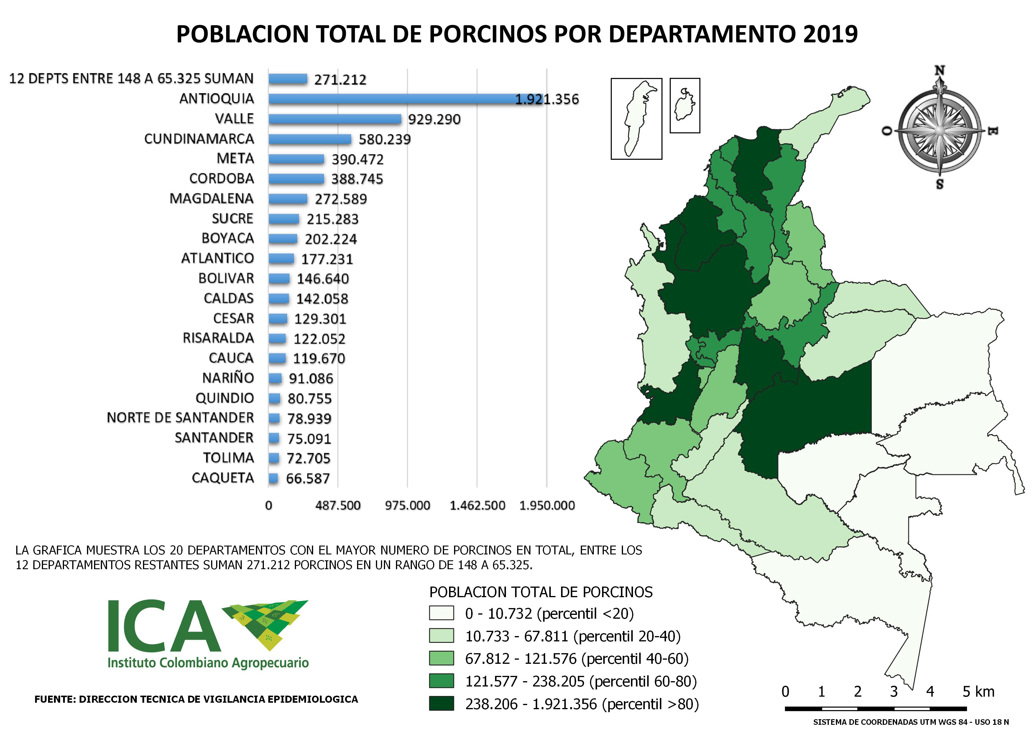 La población total porcina en el país está distribuida en 237.380 predios y constituida aproximadamente por 6.473.525 animales, ubicados principalmente en los departamentos de Antioquia (29,68%), Valle del Cauca (14,36%), Cundinamarca (8,94%), Meta (6,03%), Córdoba (6,01%), Magdalena (4,21%), Sucre (3,33%), Boyacá (3,12%), Atlántico (2,74%) y Bolivar (2,27%), indicando que el 80.67% de la población total nacional.