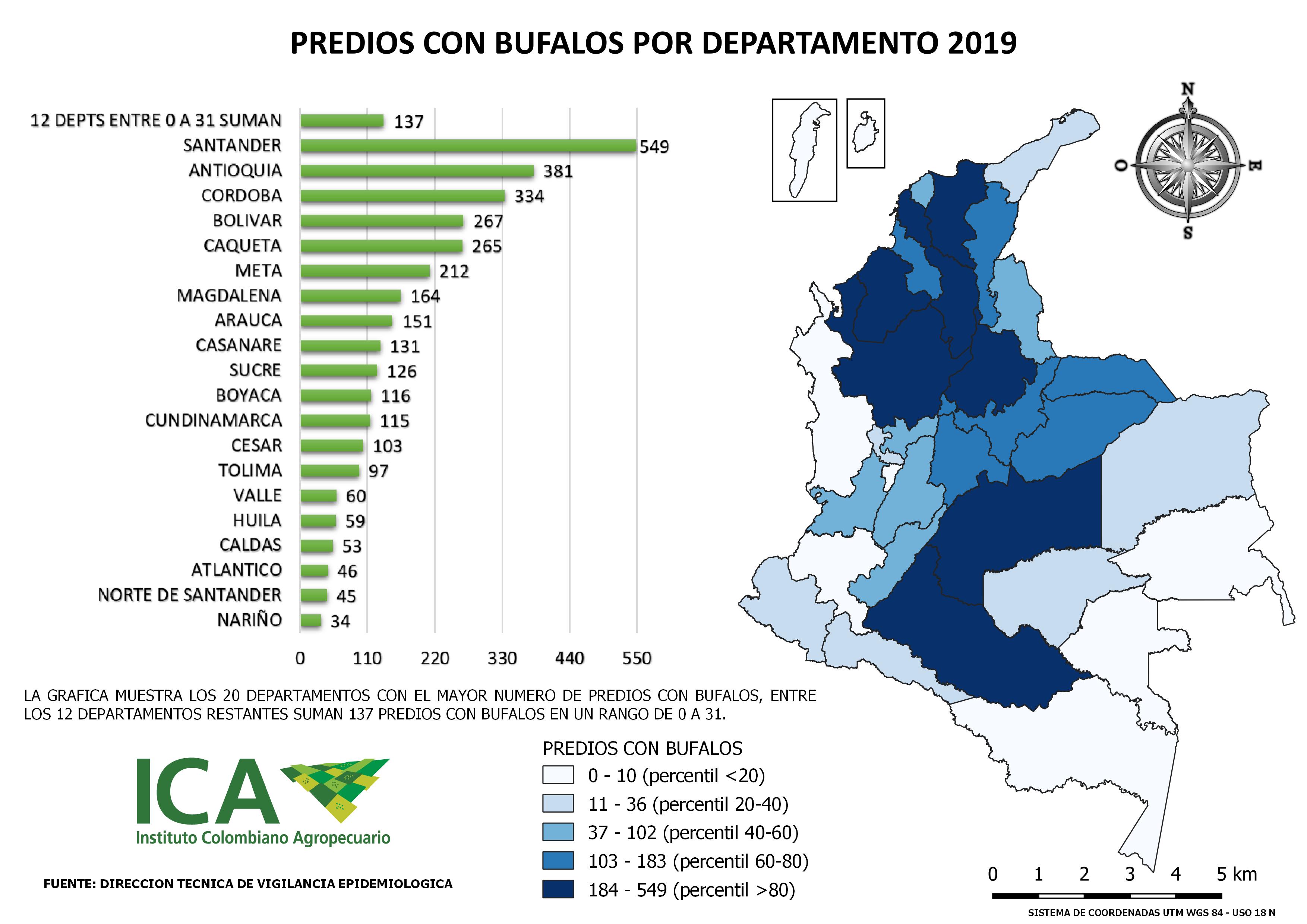 De los 4.072 predios con presencia de búfalos en el país, el 68,54% se encuentran mayoritariamente en los departamentos de Santander (9,31%), Boyacá (8,45%), Tolima (7,86%), Antioquia (7,71%), Meta (7,51%), Cundinamarca (6,88%), Huila (6,02%), Valle del cauca (5,16%), Magdalena (4,84%) y Córdoba (4,81%).