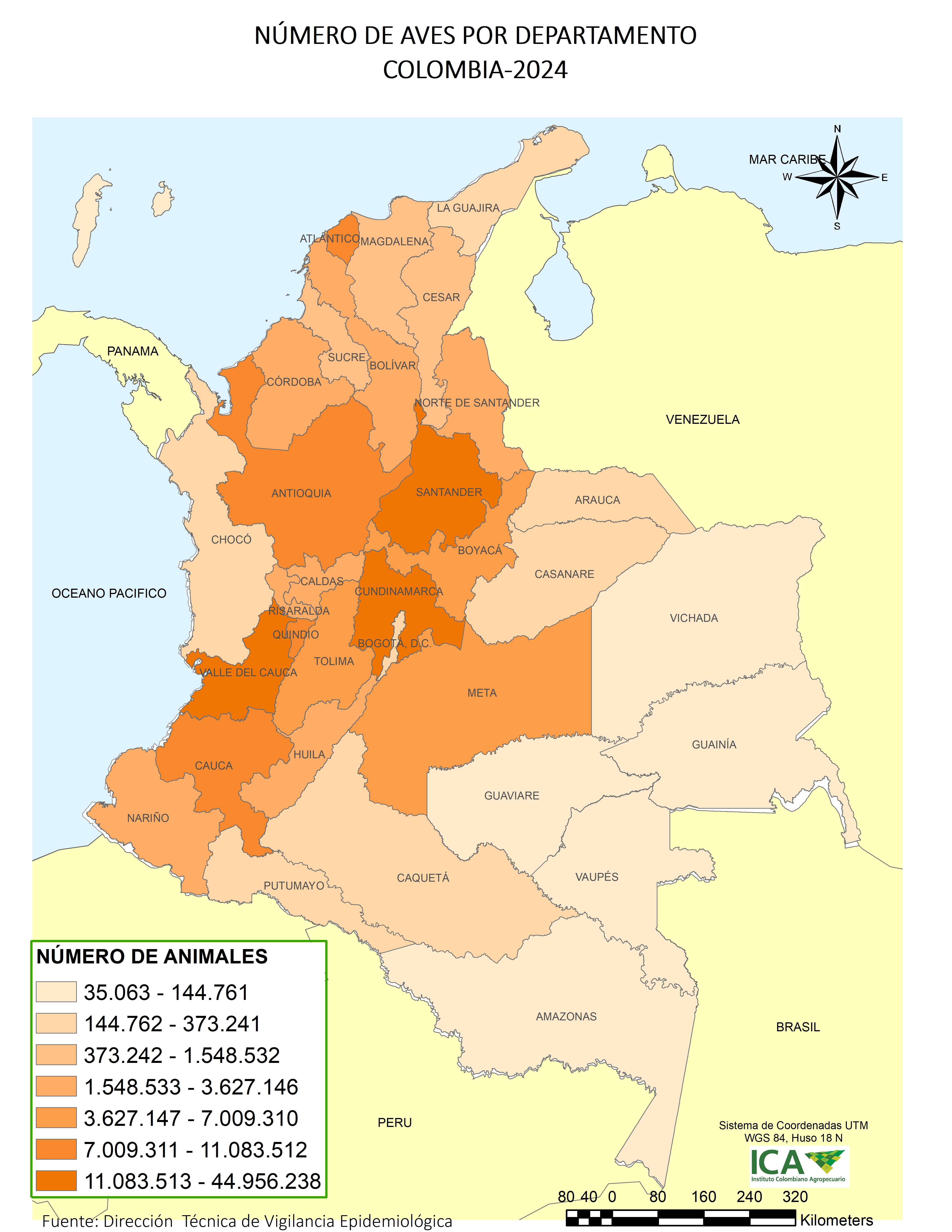 El 74% de los 468.066 predios con presencia de aves de corral en el país, se ubican en los departamentos de Antioquia (21%), Córdoba (9%), Norte de Santander (9%), Cauca (6%), Santander (5%), Meta (4%), Sucre (4%), Caquetá (4,0%), Cundinamarca (4%), La Guajira (4%), y Nariño (4%).