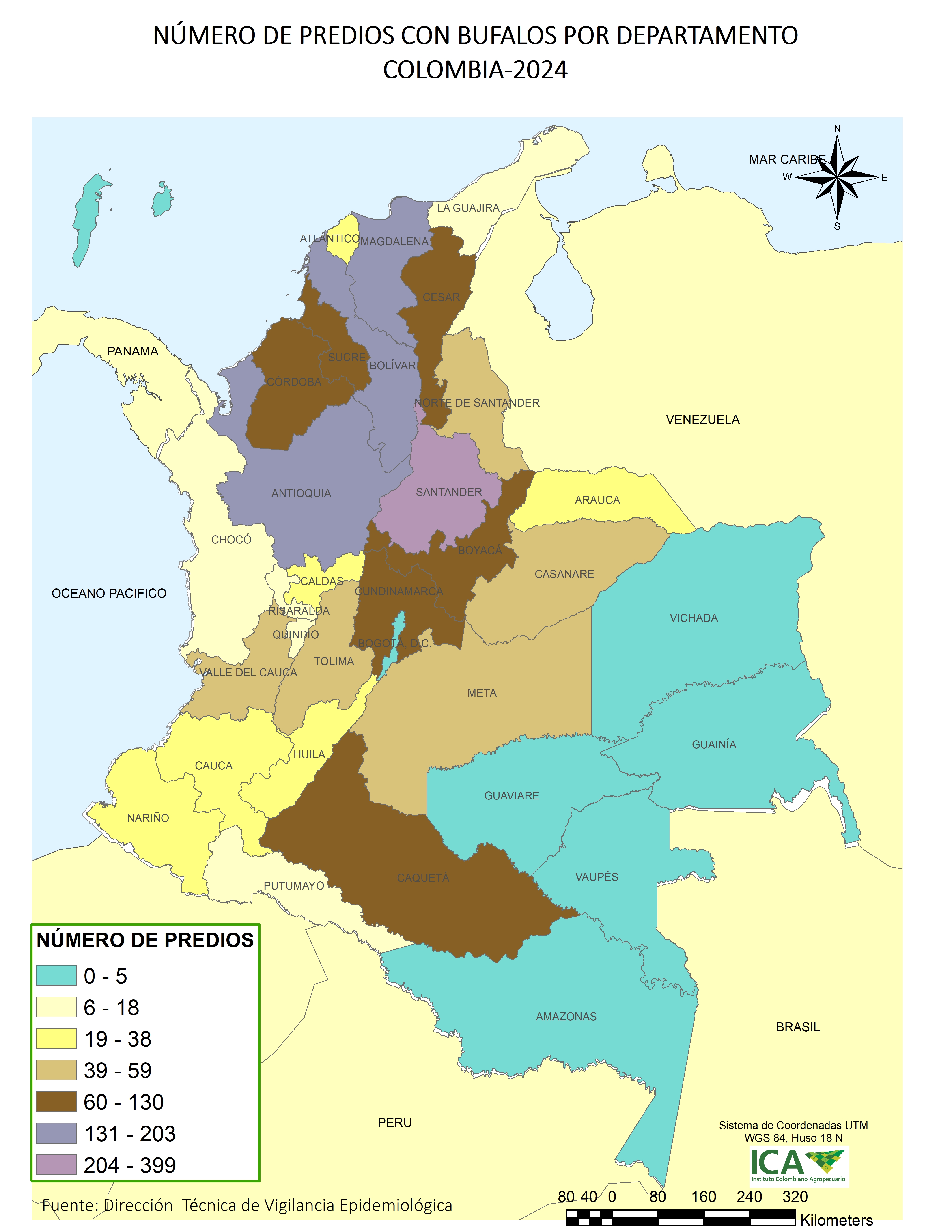 Colombia cuenta con una población bufalina de 336.417 animales distribuidos en 2.319 predios. Esta población de búfalos se concentra principalmente en los departamentos de Córdoba (26,55%), Antioquia (16,61%), Santander (13,84%), Magdalena (7,51%) y Bolivar (7,34%) que agrupan el 71,84% de la población nacional. El conocimiento de la distribución geográfica y la identificación de problemas sanitarios es fundamental en el diseño de estrategias para los programas sanitarios y la adopción de medidas de control que involucran a la especie.